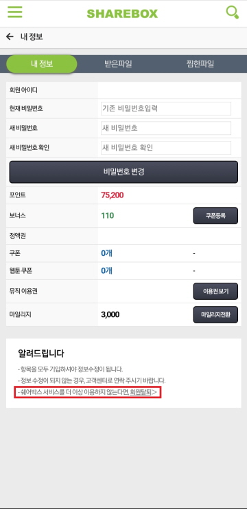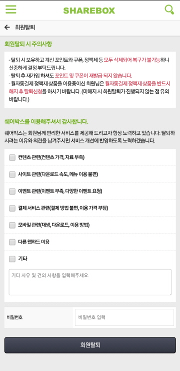 3. 회원탈퇴 시 주의 사항을 읽어보시고 탈퇴를 진행해주시기 바랍니다. ![[크기변환]20200402_154353.jpg](https://ximage.sharebox.co.kr/image/202004/1585812209_4086644.png)
